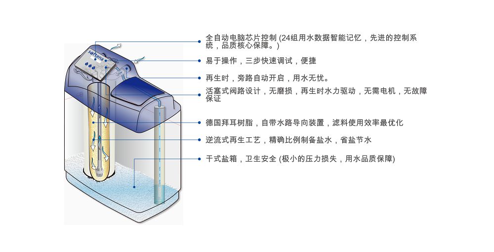 e、濾料品質(zhì)頂級、軟化效果的保障,國際先進(jìn)的濾料選擇,樹脂采用德國拜耳樹脂,軟水品質(zhì)的保證。